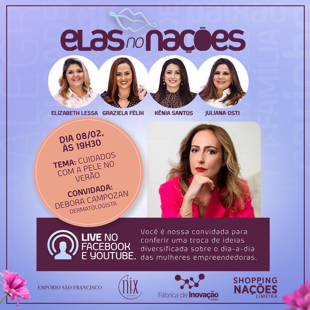 Na próxima segunda-feira, dia 8 de fevereiro, será realizada mais uma da live “Elas no Nações”, promovida pelo Shopping Nações. Desta vez, a convidada será a dermatologista e especialista em Medicina Estética Avançada, Debora Campozan, que dará dicas sobre os cuidados com a pele no verão. A live será transmitida das 19h30 às 20h30 pelo […]