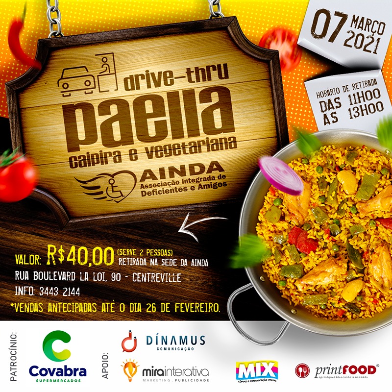 A AINDA (Associação Integrada de Deficientes e Amigos) já iniciou as vendas da tradicional paella beneficente. Diferente das versões anteriores, em respeito à pandemia, este ano não haverá o evento na Fazenda Quilombo. As entregas serão feitas por drive-thru, na sede da entidade.