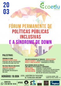 A Faculdade de Tecnologia da Unicamp (FT-Unicamp) sedia na próxima terça-feira, 20 de março, a partir das 19h, o Fórum Permanente de Políticas Públicas Inclusivas e a Síndrome de Down. A realização é do EcoEdu Ambiental, projeto de extensão que desenvolve atividades de intercâmbio entre a universidade e a comunidade limeirense.