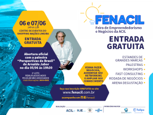 O Shopping Nações sedia nos dias 6 e 7 de junho, das 14h às 22h, a Feira de Empreendedorismo e Negócios da Associação Comercial e Industrial de Limeira (FENACIL). O evento terá entrada gratuita e os visitantes já podem se cadastrar no site www.fenacil.com.br. Após a inscrição online, as credenciais devem ser retiradas na entrada do evento.