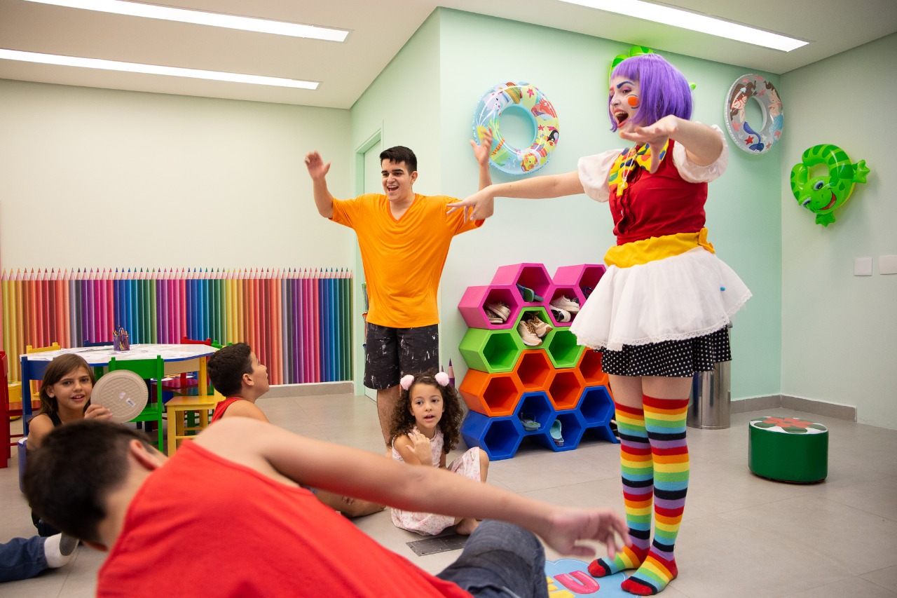 Todas as atividades no Espaço Kids são gratuitas. A palhacinha Amora se apresenta das 15h30 às 17h30, mas há outras opções no local à disposição durante todo o horário de funcionamento do Shopping Nações.