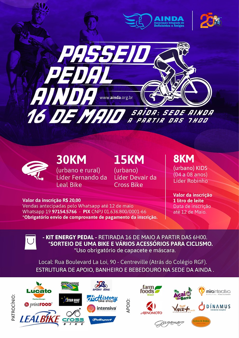 A Associação Integrada de Deficientes e Amigos de Limeira (AINDA) promoverá, no dia 16 de maio, a primeira edição do “Pedal AINDA”. O evento vai reunir ciclistas de Limeira e região para percursos urbano e rural de 30 e 15 km.