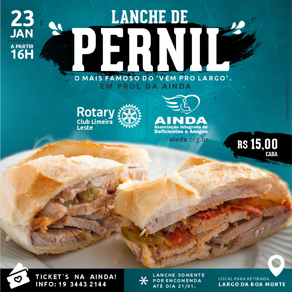 O lanche de pernil, um dos mais tradicionais do “Vem pro Largo”, está sendo vendido pelo Rotary Club Limeira Leste para ajudar a AINDA (Associação Integrada de Deficientes e Amigos). As encomendas podem ser feitas até o dia 21 deste mês diretamente na entidade e a retirada será no dia 23, no Largo da Boa Morte.